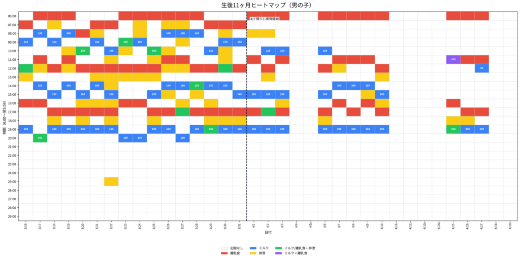 ヒートマップを見ると、朝6時台の離乳食はかなり固定化。