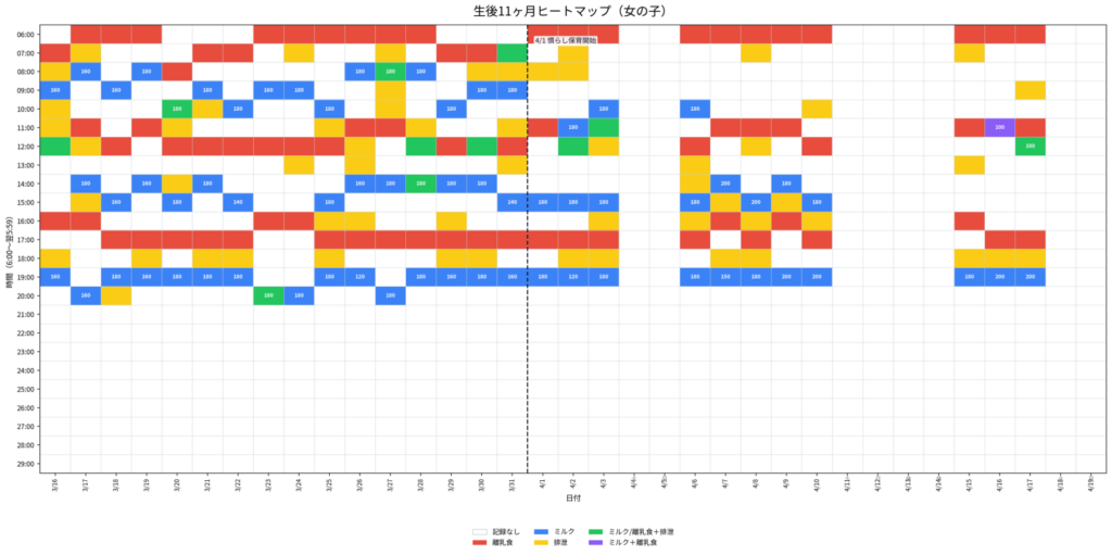 一方でミルクは、前月までの「午前中心」から、午後〜夕方、そしてお風呂後 へと重心が移ってきました。