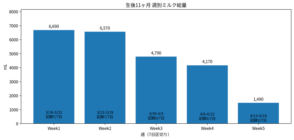 週ごとのミルク量。総量だけだと減って見えるけど、中身は少し違う