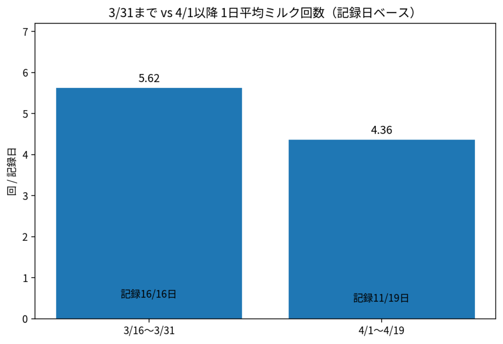 | 1日平均ミルク回数 | 5.63回/日 | 4.36回/日 | -1.26回/日 |
