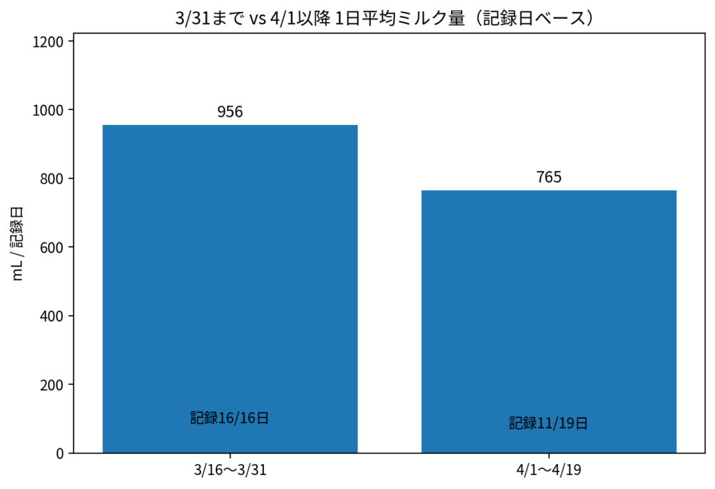 | 1日平均ミルク量 | 956mL/日 | 765mL/日 | -190mL/日 |