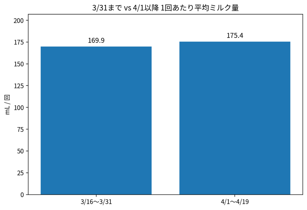 | 1回あたり平均ミルク量 | 約170mL | 約175mL | +約5mL |