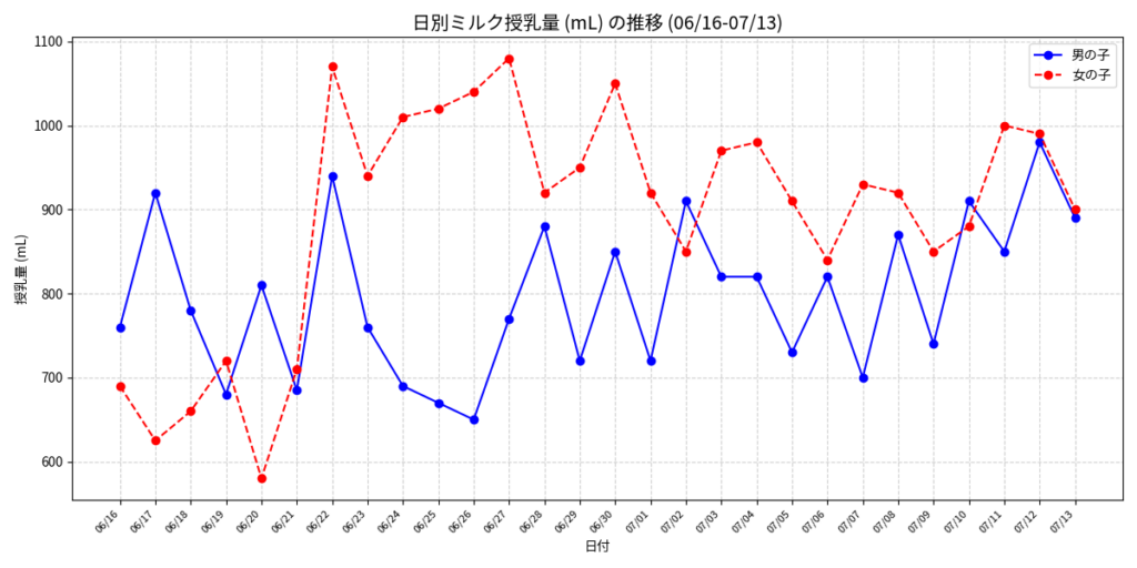 • 女の子のミルク量が全体的に多い(1日1,000mL前後の日がある)