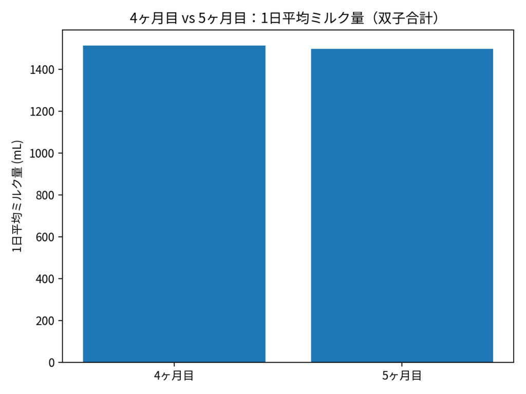 | 1日平均ミルク量 | 1,513mL/日 | 1,499mL/日 | -14mL/日(ほぼ横ばい) |