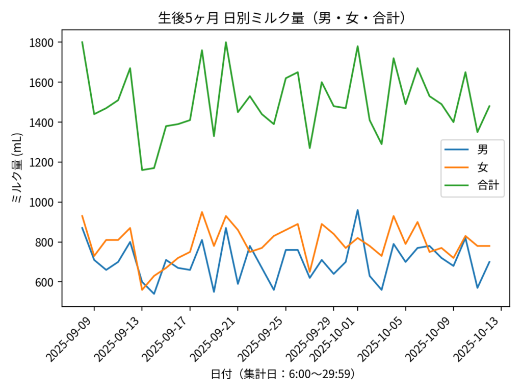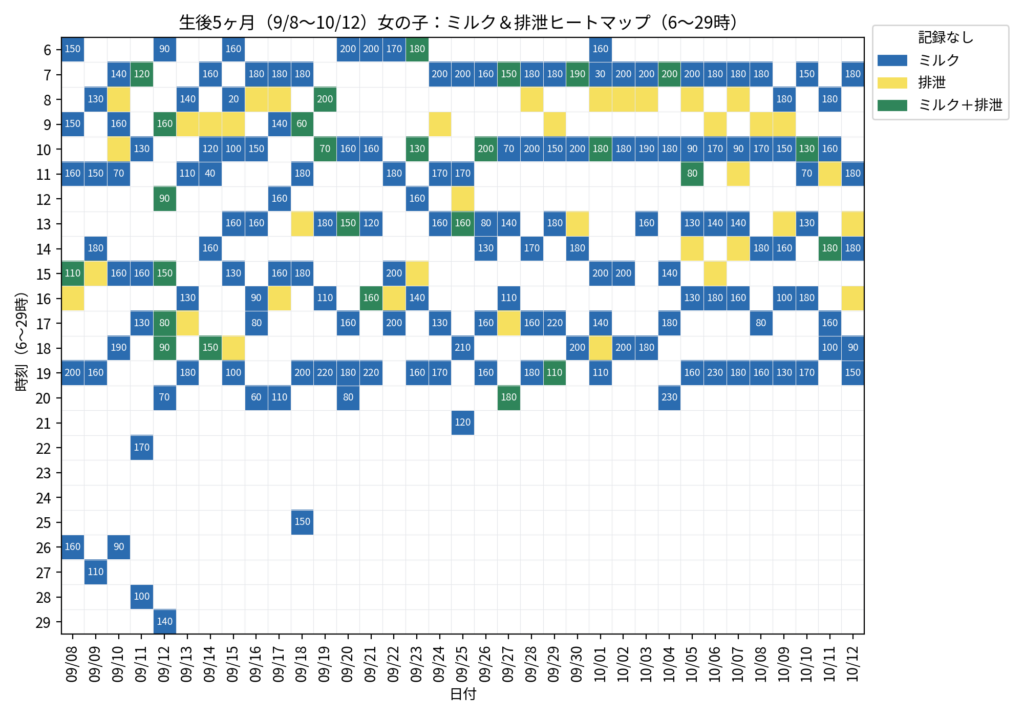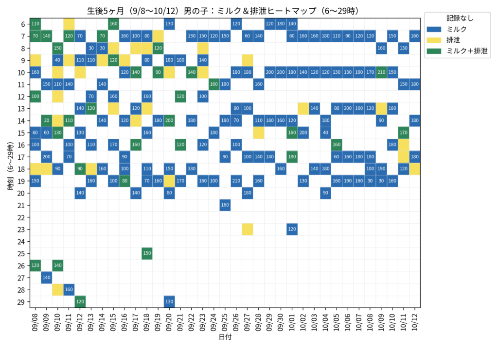 この記事では、生後5ヶ月(2025/9/8〜10/12:35日分)の授乳・排泄ログをもとに、