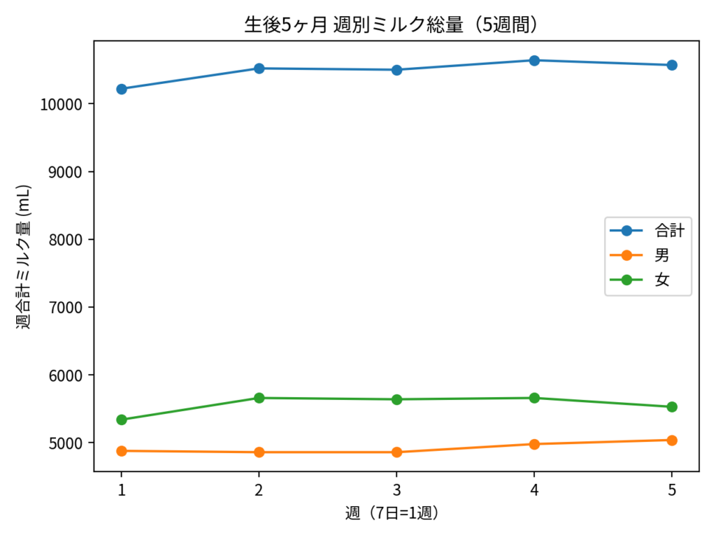 女の子の1日平均903mlは、男の子の763mlを140mlも上回っています。この差は、3ヶ月目(約50ml差)、4ヶ月目(約118ml差)から着実に広がっています。