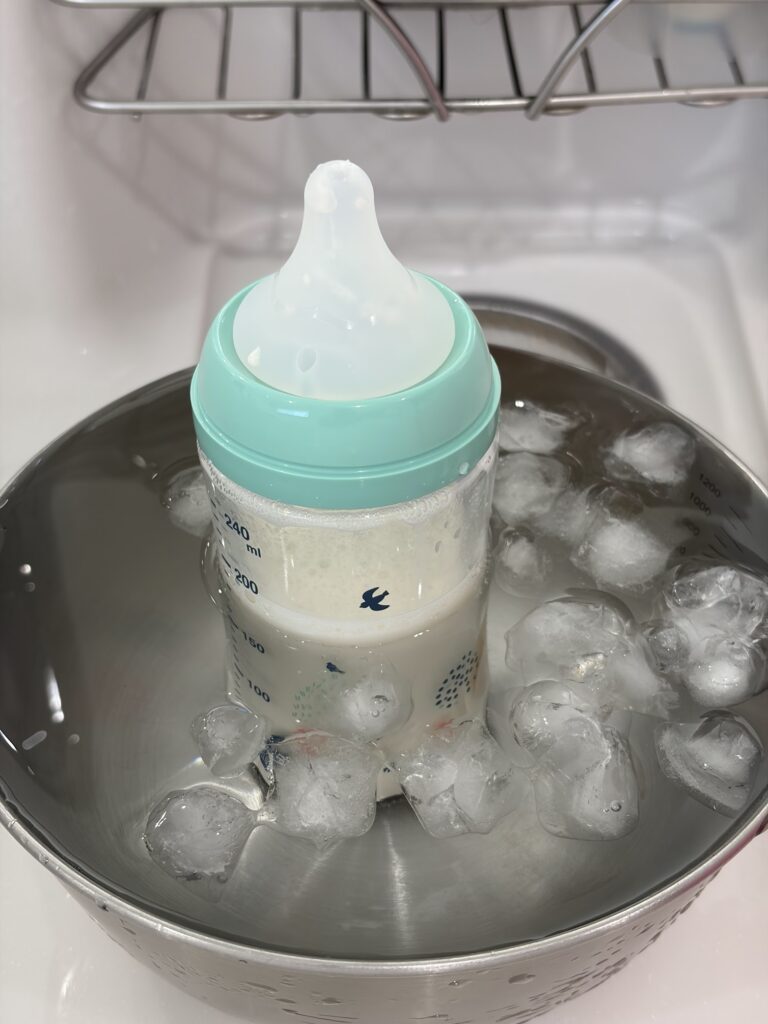 我が家では氷水を張った大きめのボウルに哺乳瓶を入れて、ゆすりながら冷却。