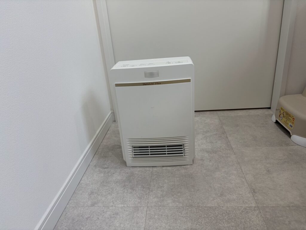 浴室から出た瞬間の寒さがつらいので、浴室前に小型のセラミックヒーターを置きました。
